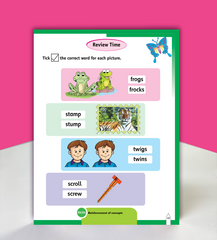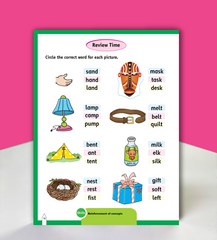 • Phonics workbook for kids covering word blends, vowel teams, and sentence practice.